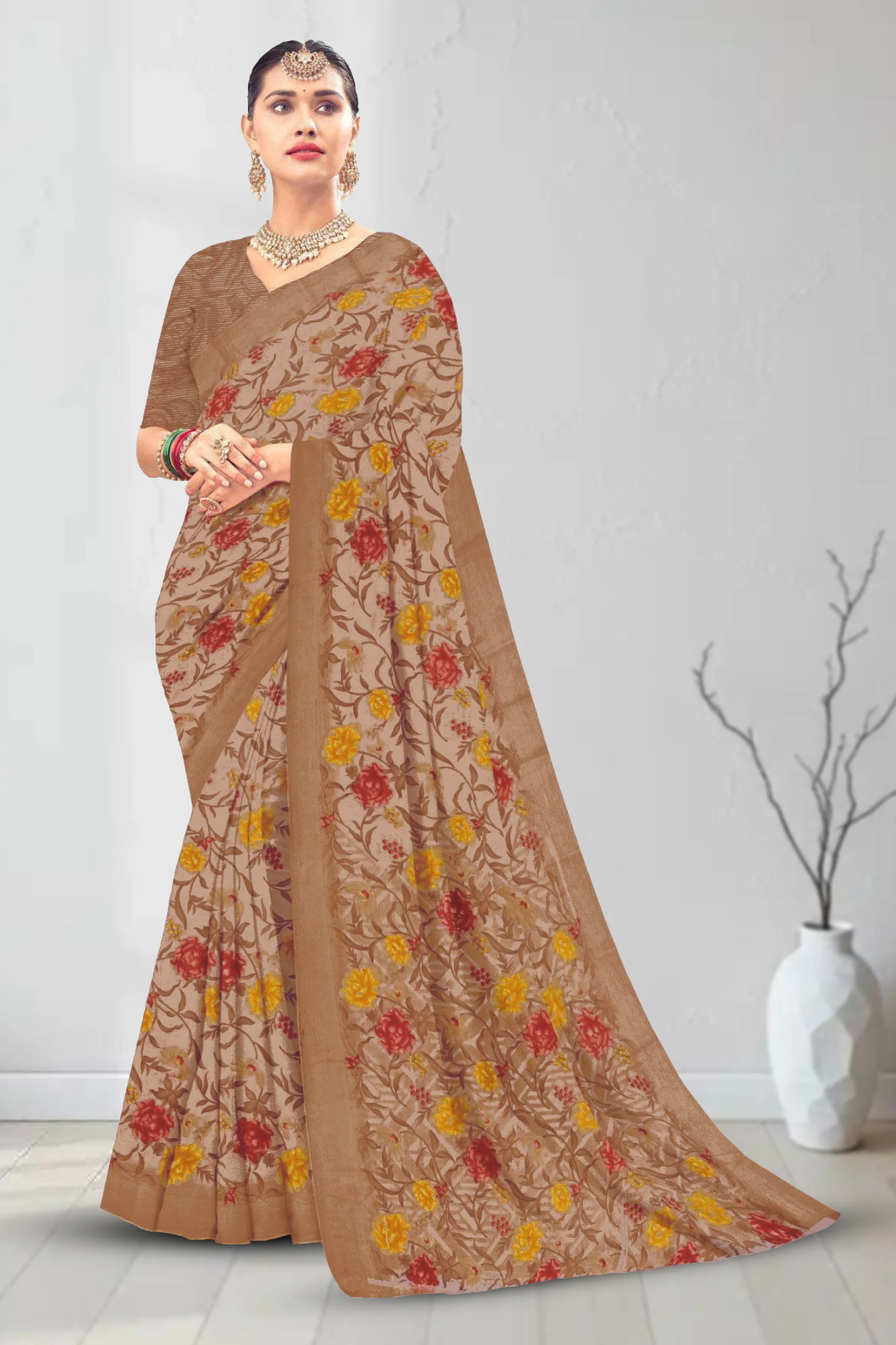 Lightweight chiffon saree with elegant loose printed design and a soft flowing drape.