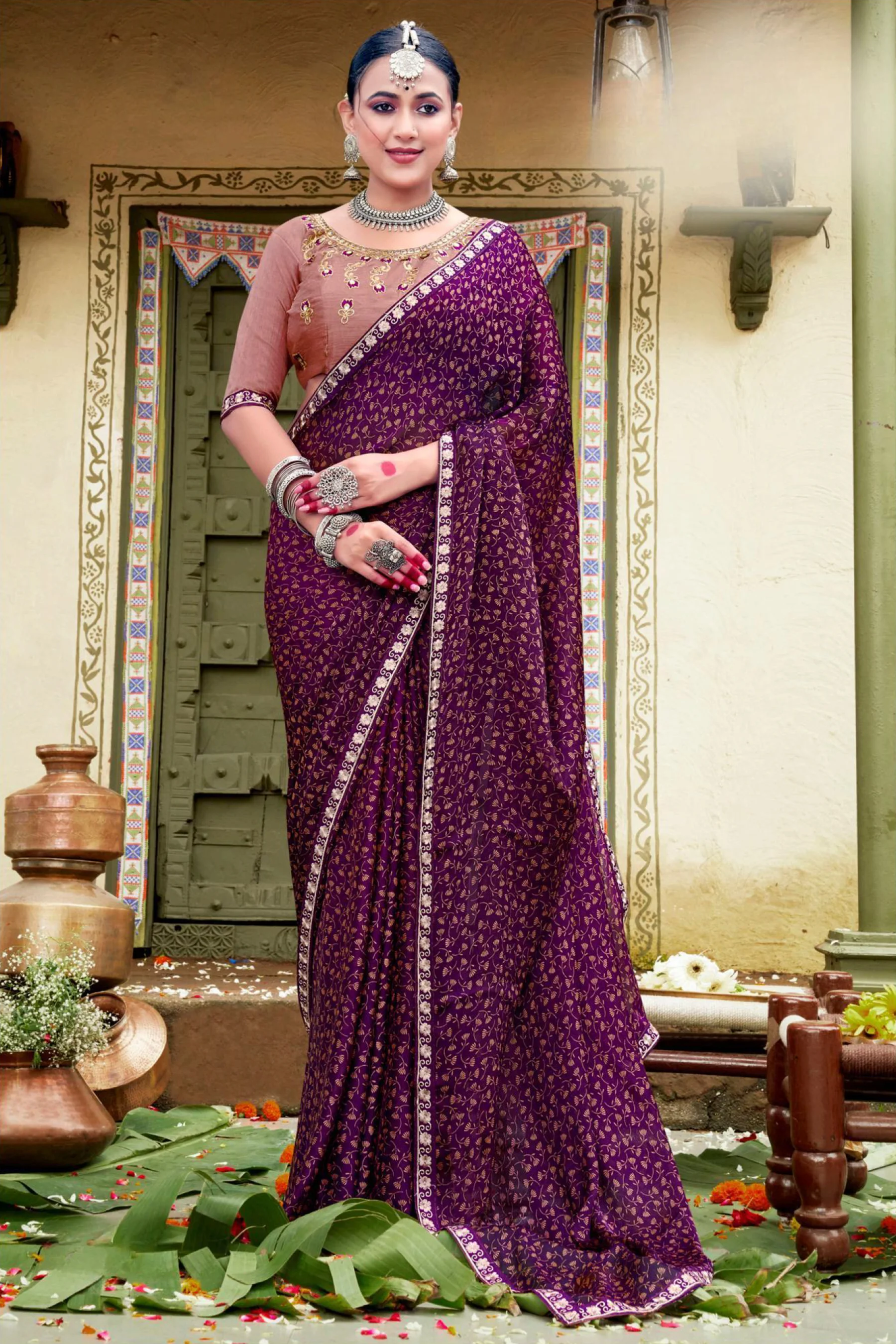 Stylish printed saree enhanced with elegant lace detailing for a graceful finish.