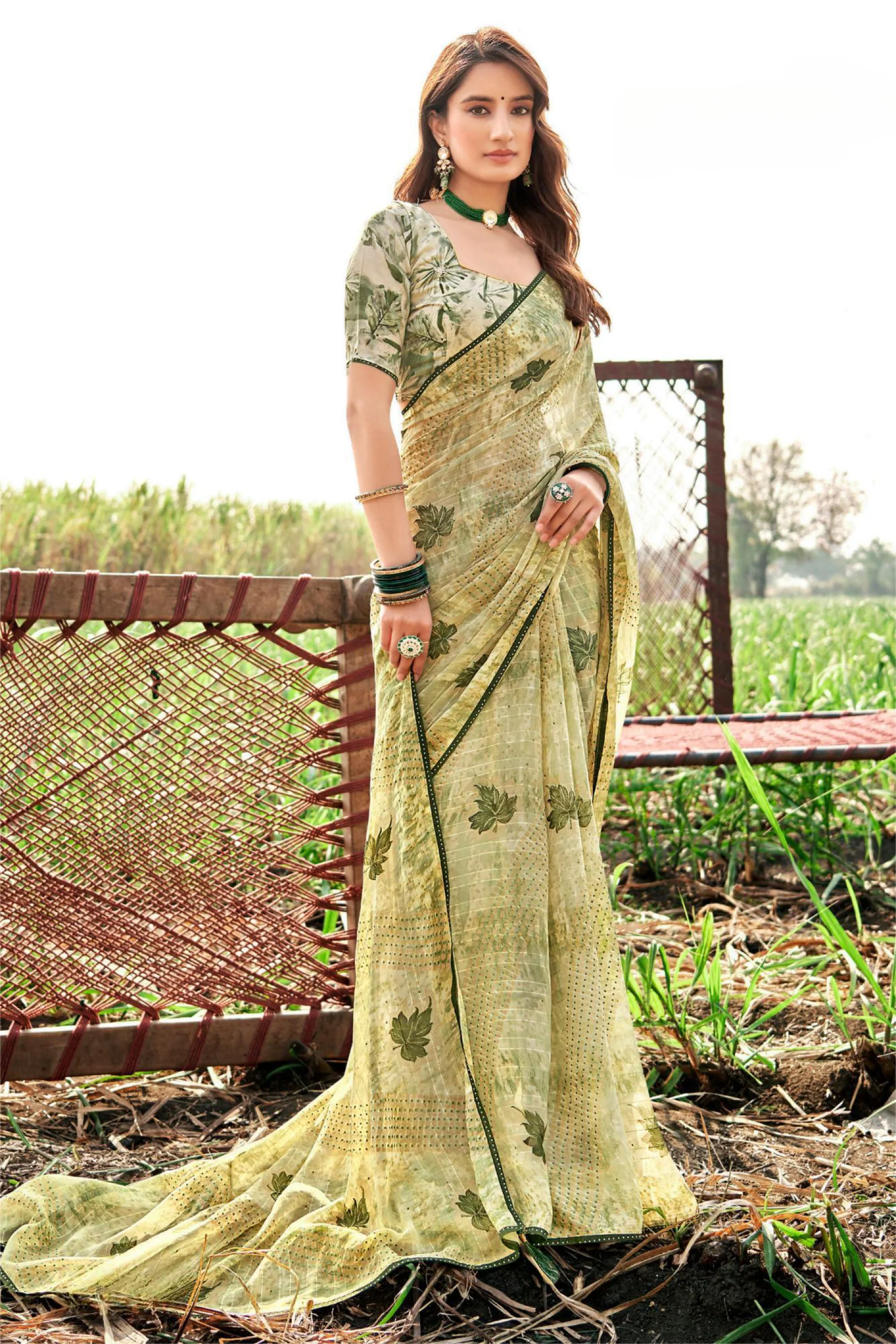 Comes with a matching unstitched blouse piece for customized stitching.