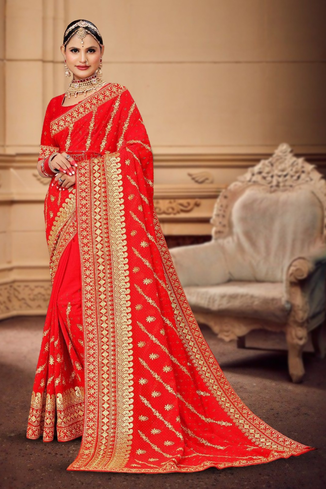 This fancy embroidery work saree is made from high-quality 60 GM blooming fabric, offering a rich and elegant look. It comes with a matching unstitched blouse piece and measures 6.30 meters in length. Ideal for weddings, parties, and festive occasions. Packed securely in premium box packaging for safe delivery and storage.
