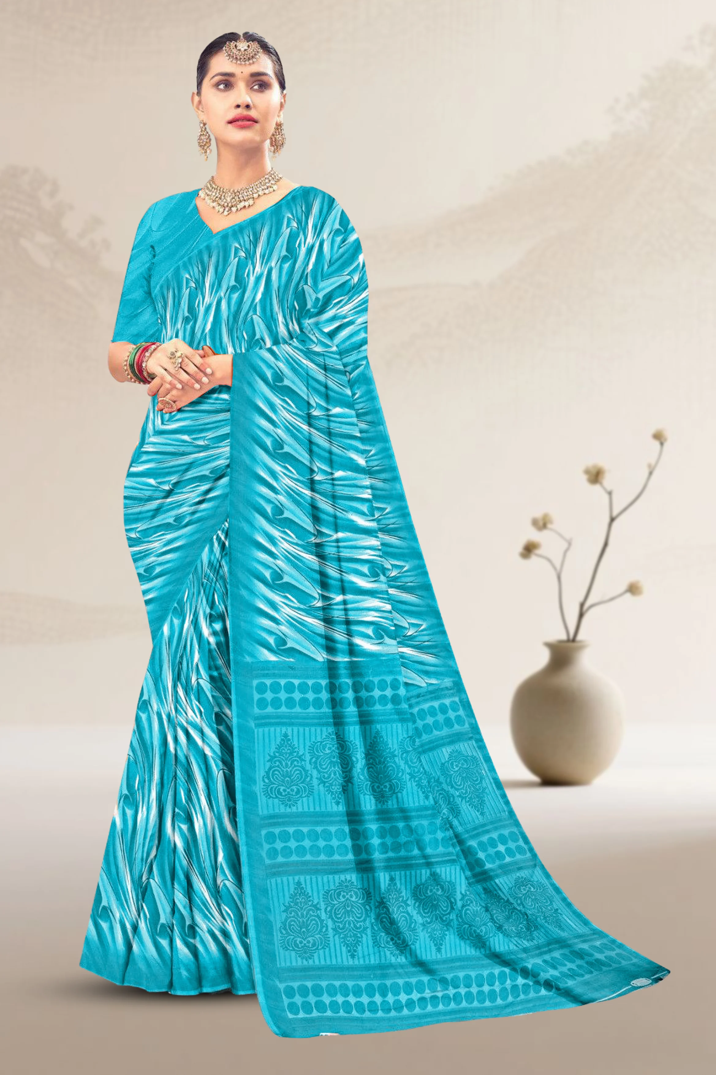 Lightweight chiffon saree with elegant loose printed design and a soft flowing drape.