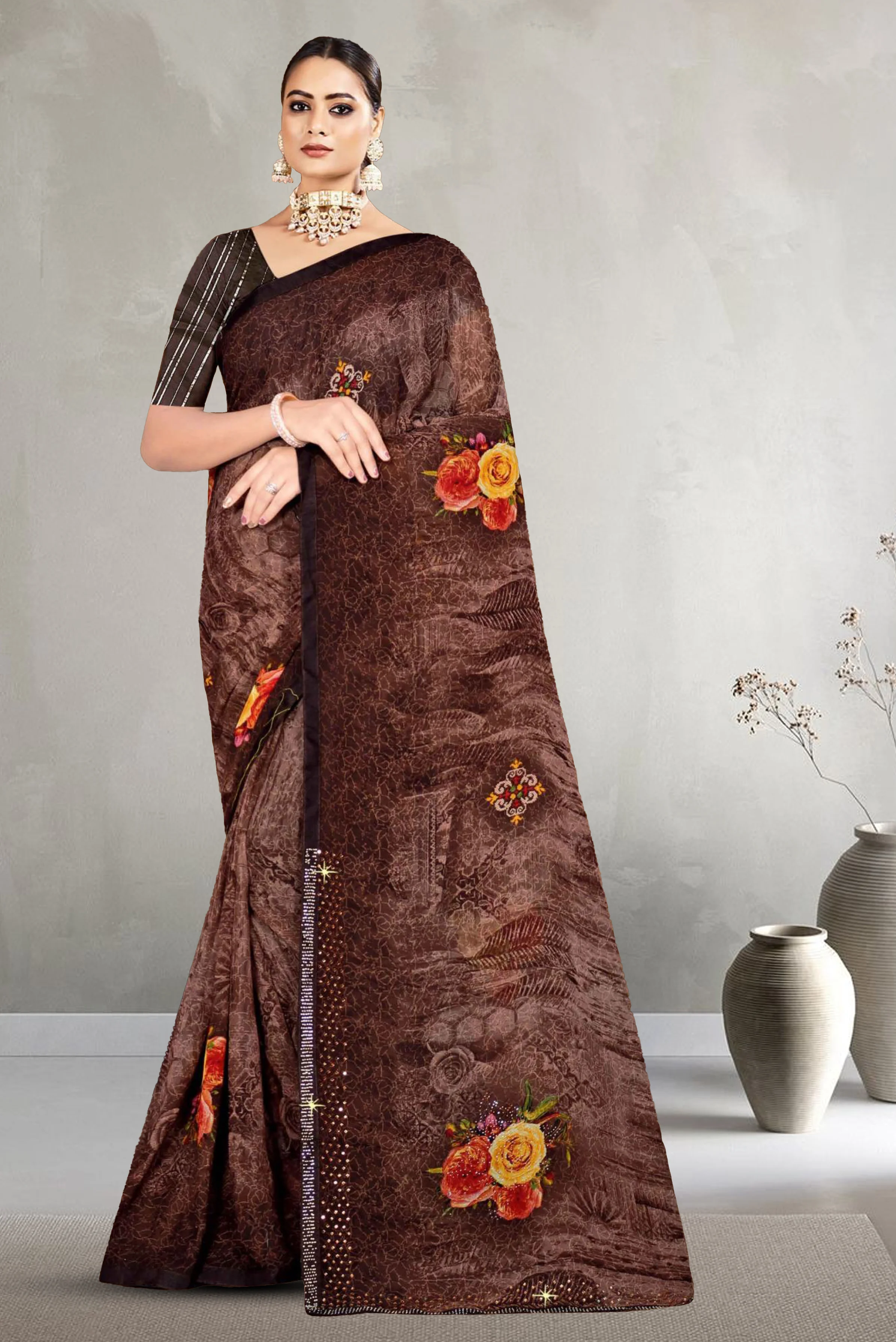 Smooth chiffon printed saree designed with a soft, lightweight fabric that drapes beautifully.