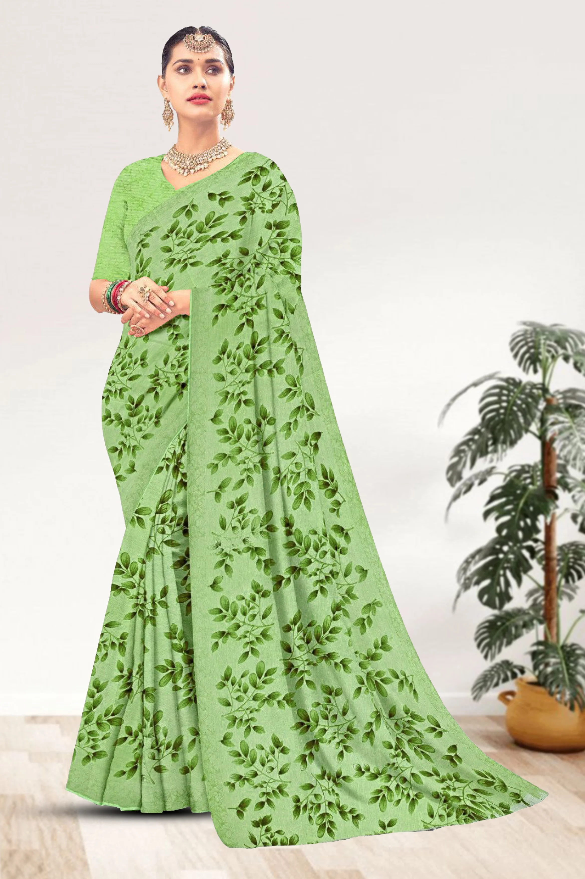 Lightweight chiffon saree with elegant loose printed design and a soft flowing drape.