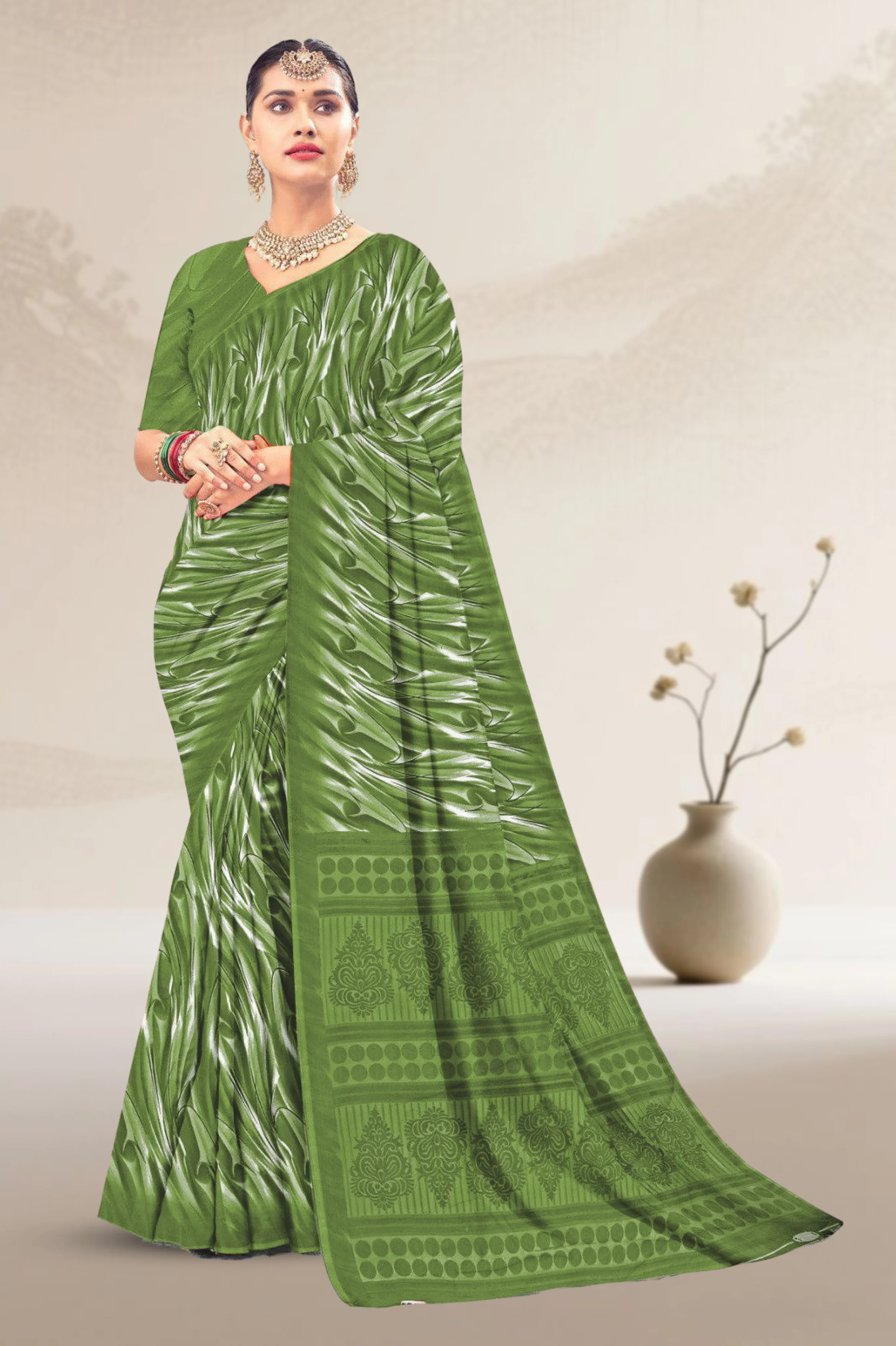 Lightweight chiffon saree with elegant loose printed design and a soft flowing drape.