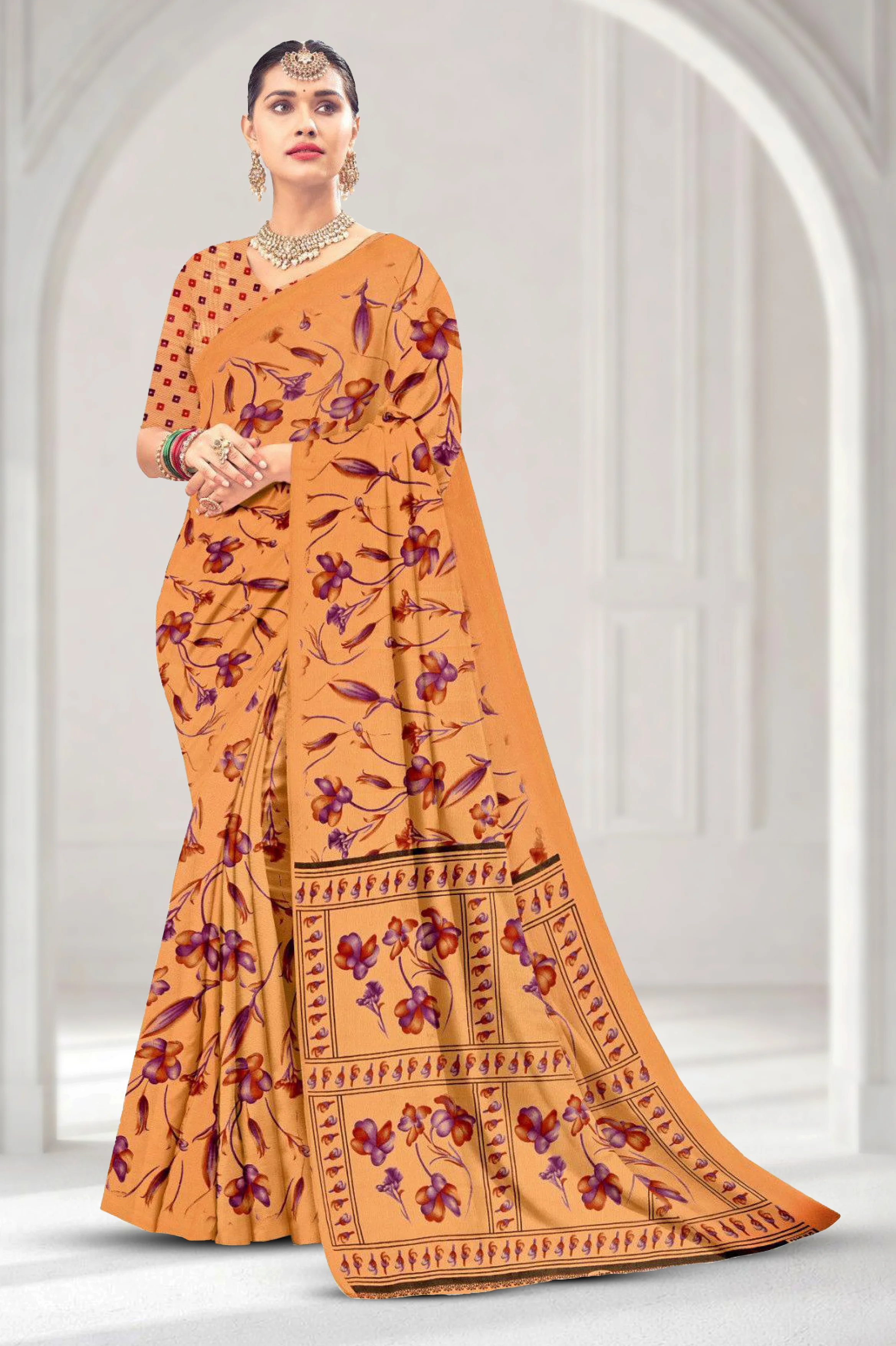 Lightweight chiffon saree with elegant loose printed design and a soft flowing drape.
