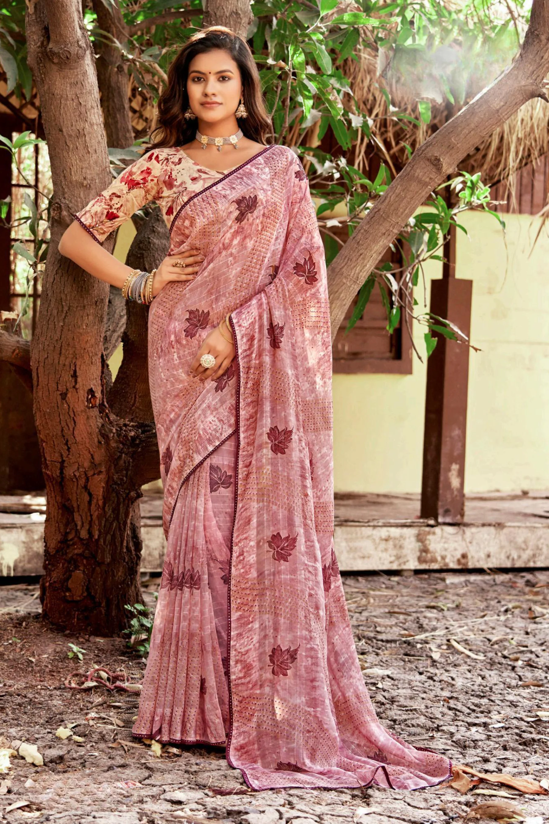 Stylish printed saree enhanced with elegant lace detailing for a graceful finish.
