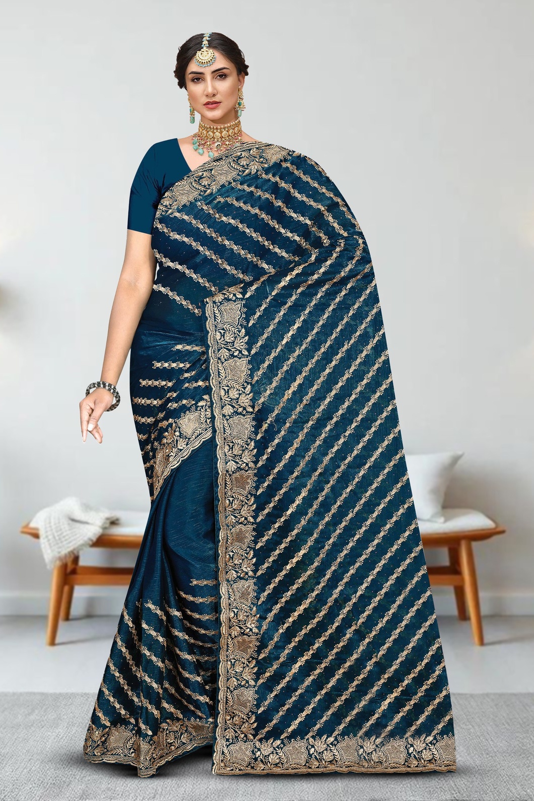 This dyed embroidery work saree is made from premium fancy silk fabric, offering a rich and elegant appearance. It comes with a matching unstitched blouse piece and measures 6.30 meters in length. Suitable for weddings, festive occasions, and parties. Packed securely in plastic bag packaging for safe storage and convenient handling.