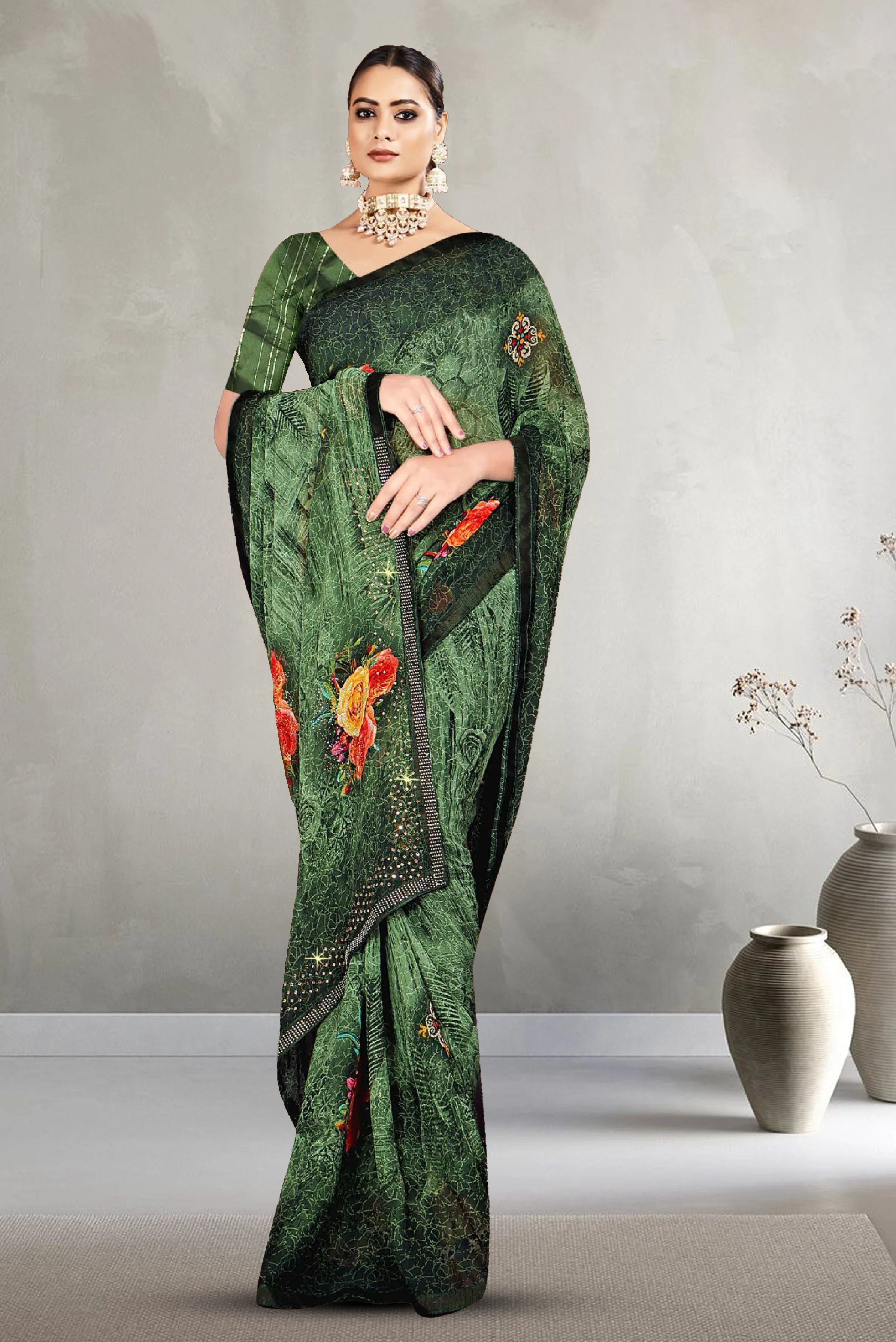 Smooth chiffon printed saree designed with a soft, lightweight fabric that drapes beautifully.