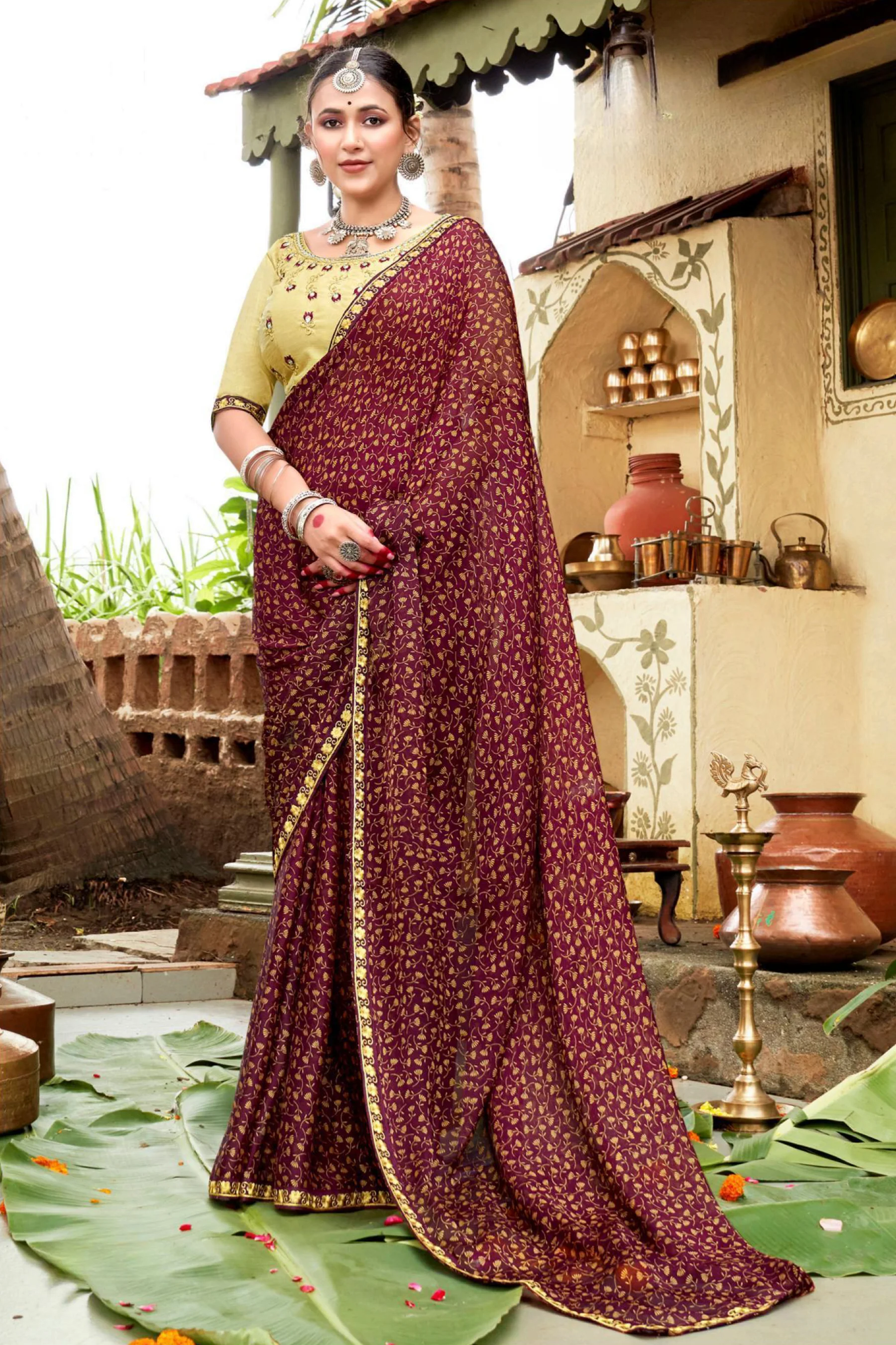 Stylish printed saree enhanced with elegant lace detailing for a graceful finish.