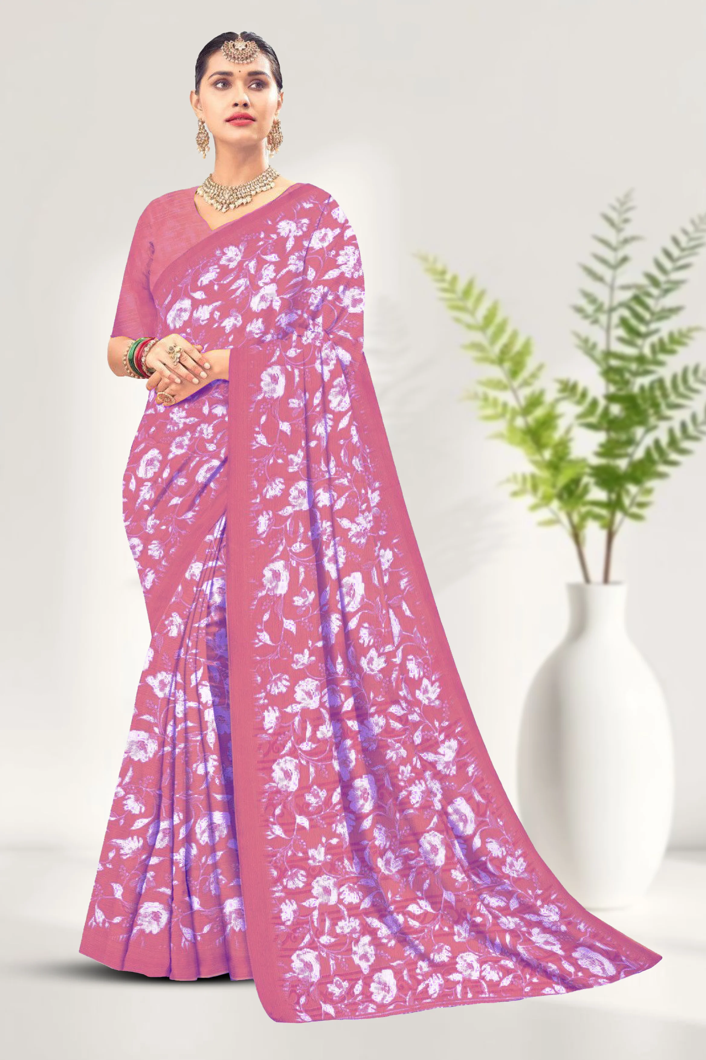 Lightweight chiffon saree with elegant loose printed design and a soft flowing drape.