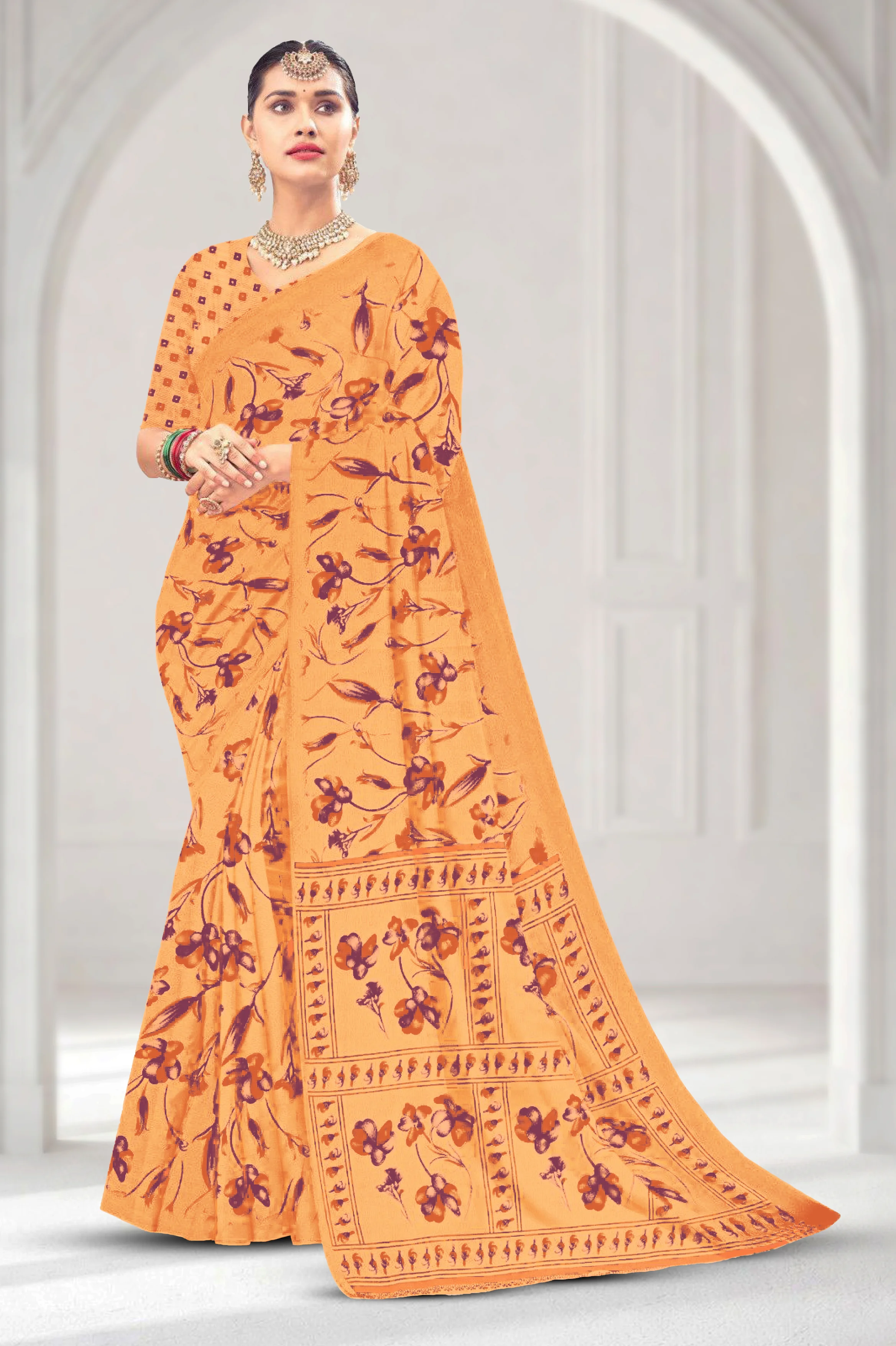 Lightweight chiffon saree with elegant loose printed design and a soft flowing drape.