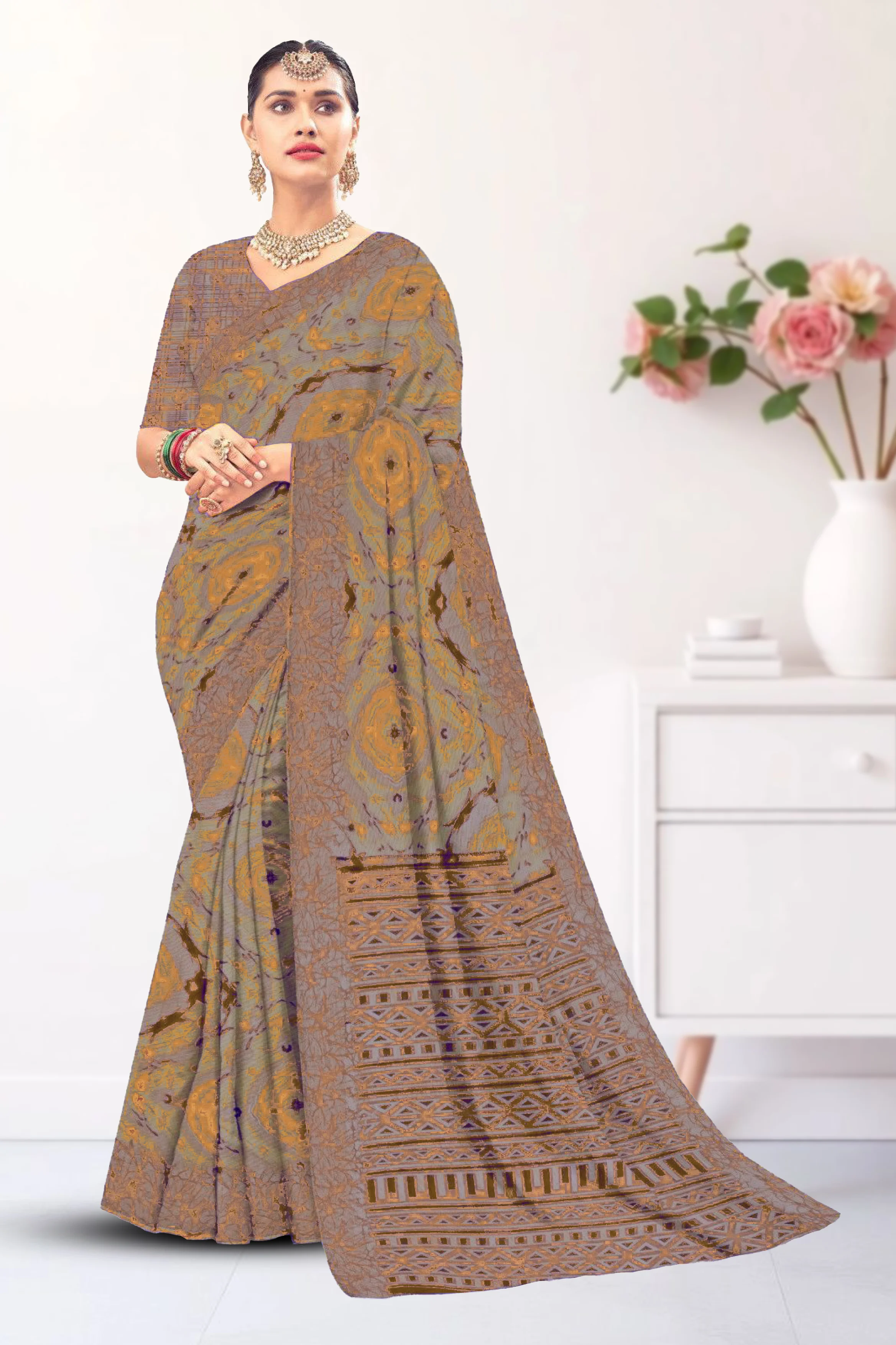 Lightweight chiffon saree with elegant loose printed design and a soft flowing drape.